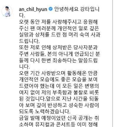 (안녕하세요 강타입니다. 오랫동안 저를 사랑해주시고 응원해주신 팬 여러분께 개인적인 일로 깊은 실망과 상처를 드린 점 머리 숙여 사과드립니다.